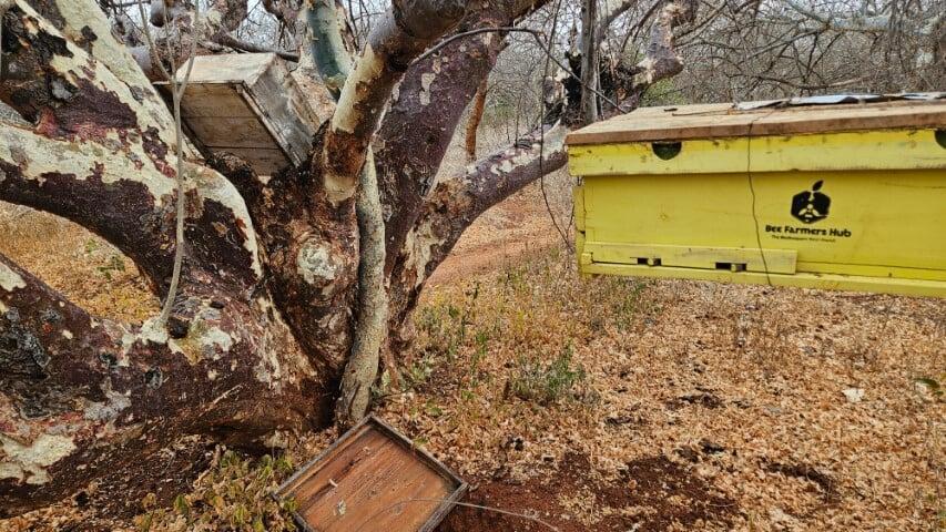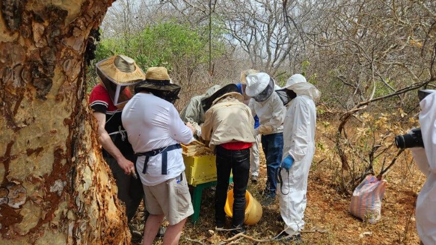 The 2025 BEE in Kenya Tour was amazing. This year we got to experience the Maasai harvesting honey from a bee tree. African bees are notoriously more aggressive then bees kept in the United States. Often you will see someone in the US not using gloves or sometimes even skipping the veil on a known docile colony. I have experienced first hand how aggressive the bees can be in Kenya. Simply walking past a beehive that was 30-40 feet away elicited alarm pheromone that caused the colony to pour out of their hive and attack me. Having experienced that, I was extremely interested to see how the Maasai would handle this aggressive behavior. Simple, they just built a fire a few feet from the bee tree and then took a burning stick and shoved it into the earth to put out the flames, then with the stick smoldering, they stuck it into the cavity of the bee tree followed by their bare hand and grabbed chunks of honeycomb and pulled it out. Surprisingly enough they only got stung a few times. Once they were satisfied that they collected all the honey we all ate it on the spot.